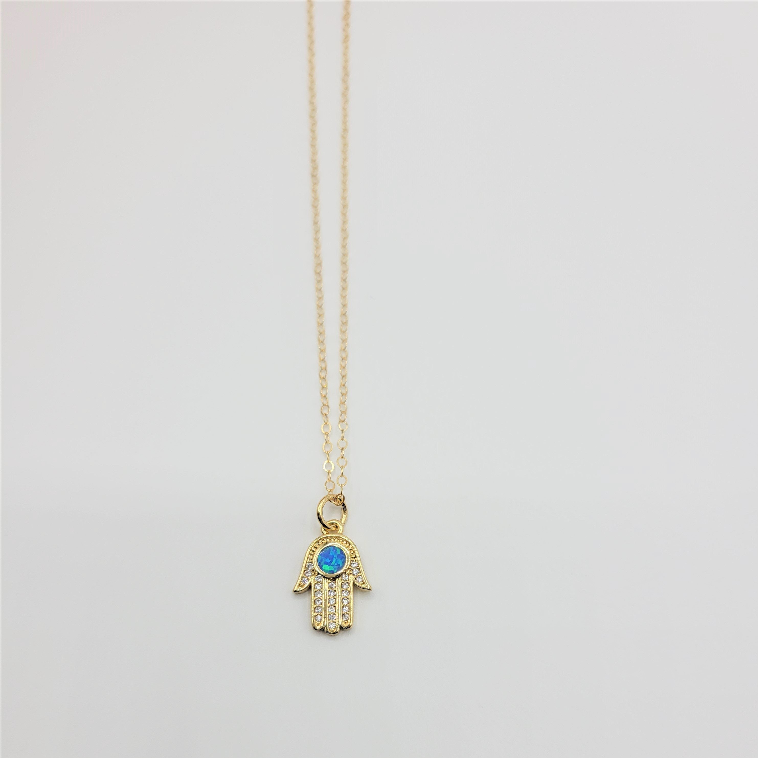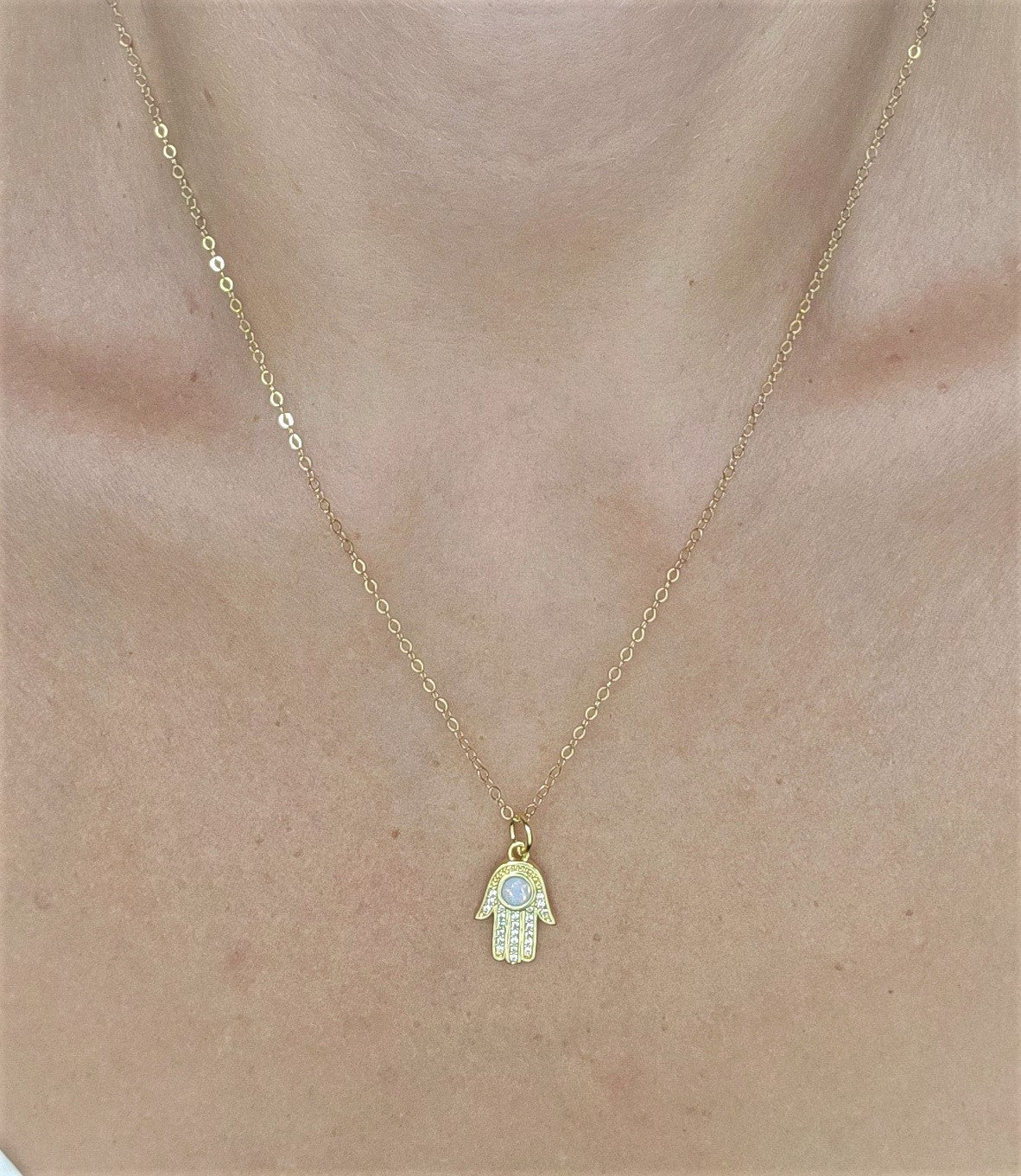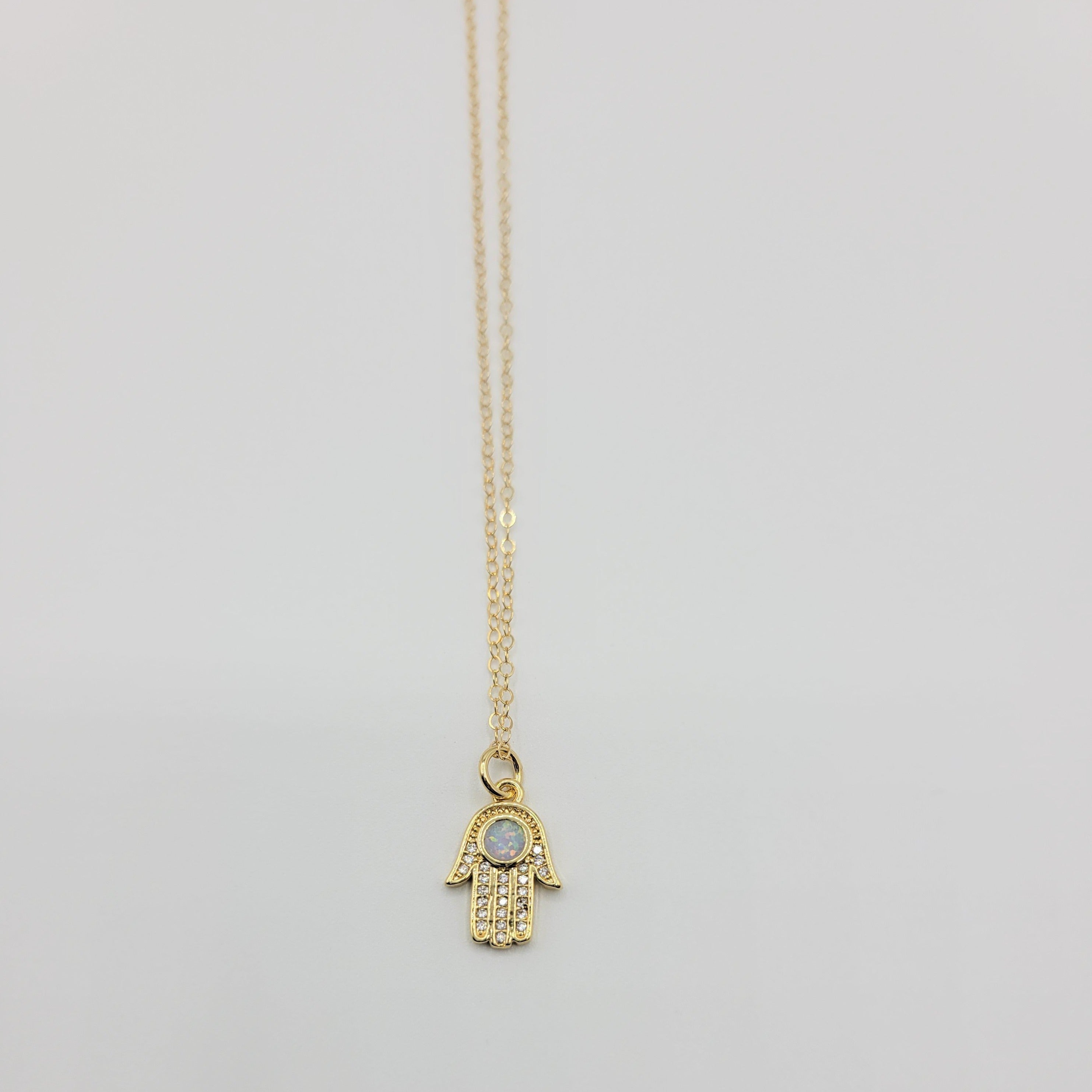 Hamsa hand charm necklace. Wear it on it's own or layer it. Strung on sturdy non tarnish gold filled very dainty cable chain.