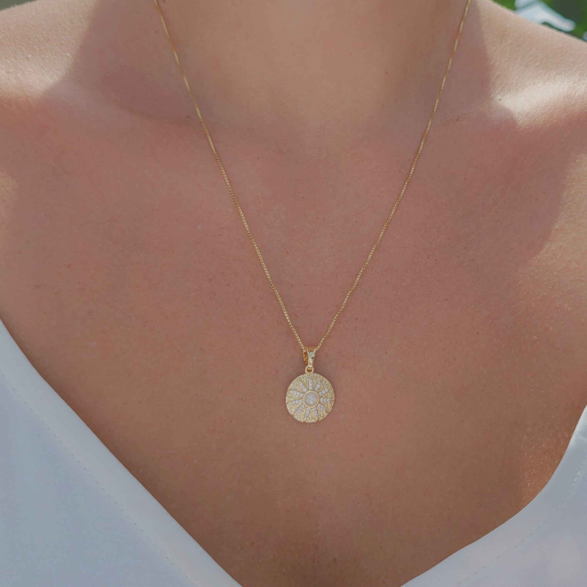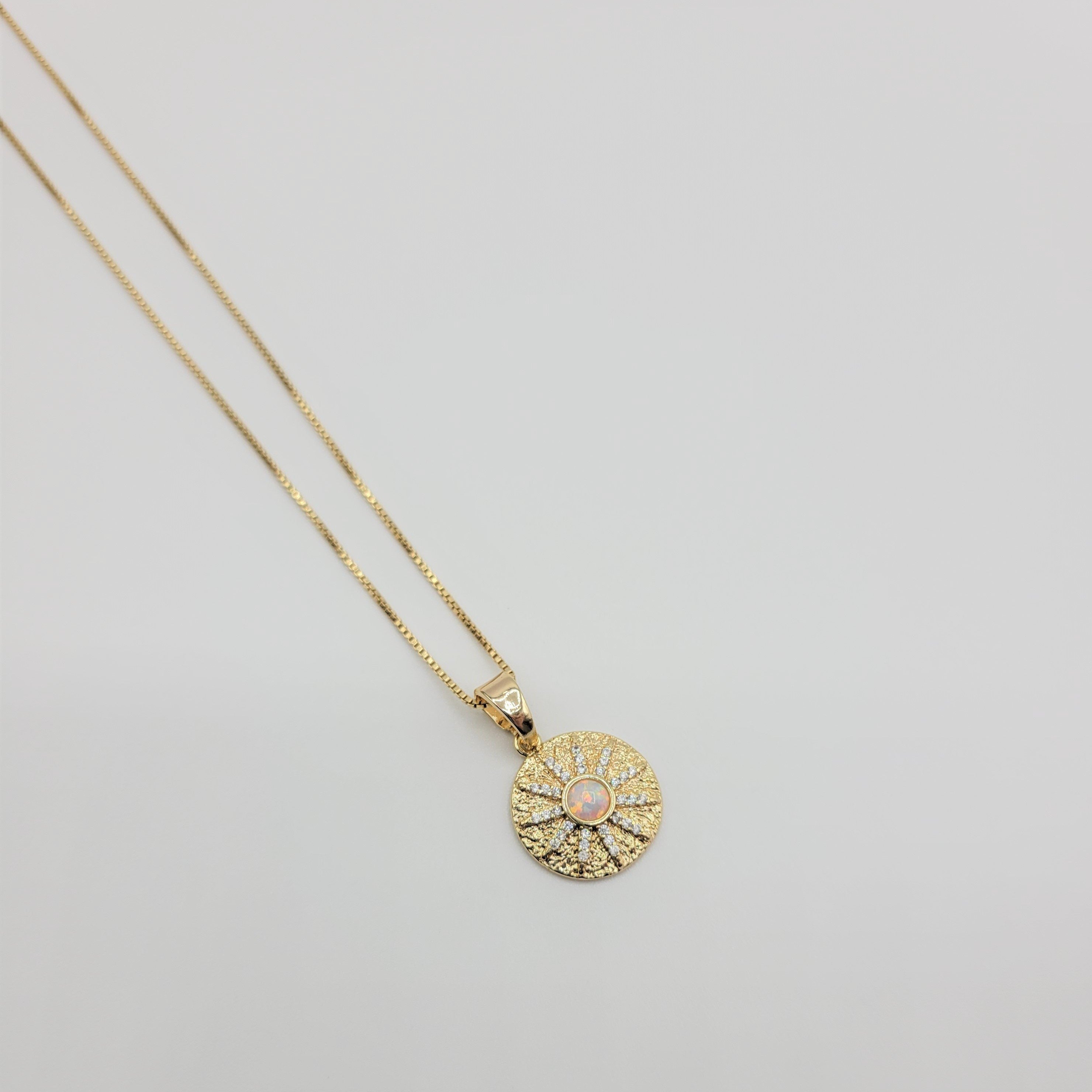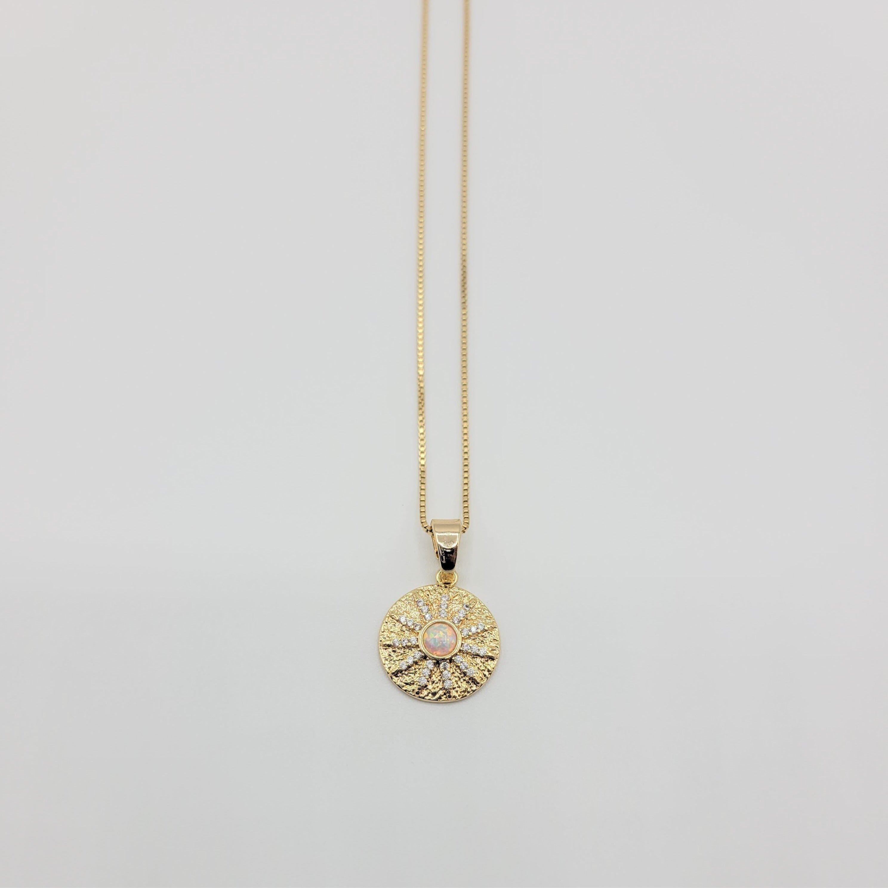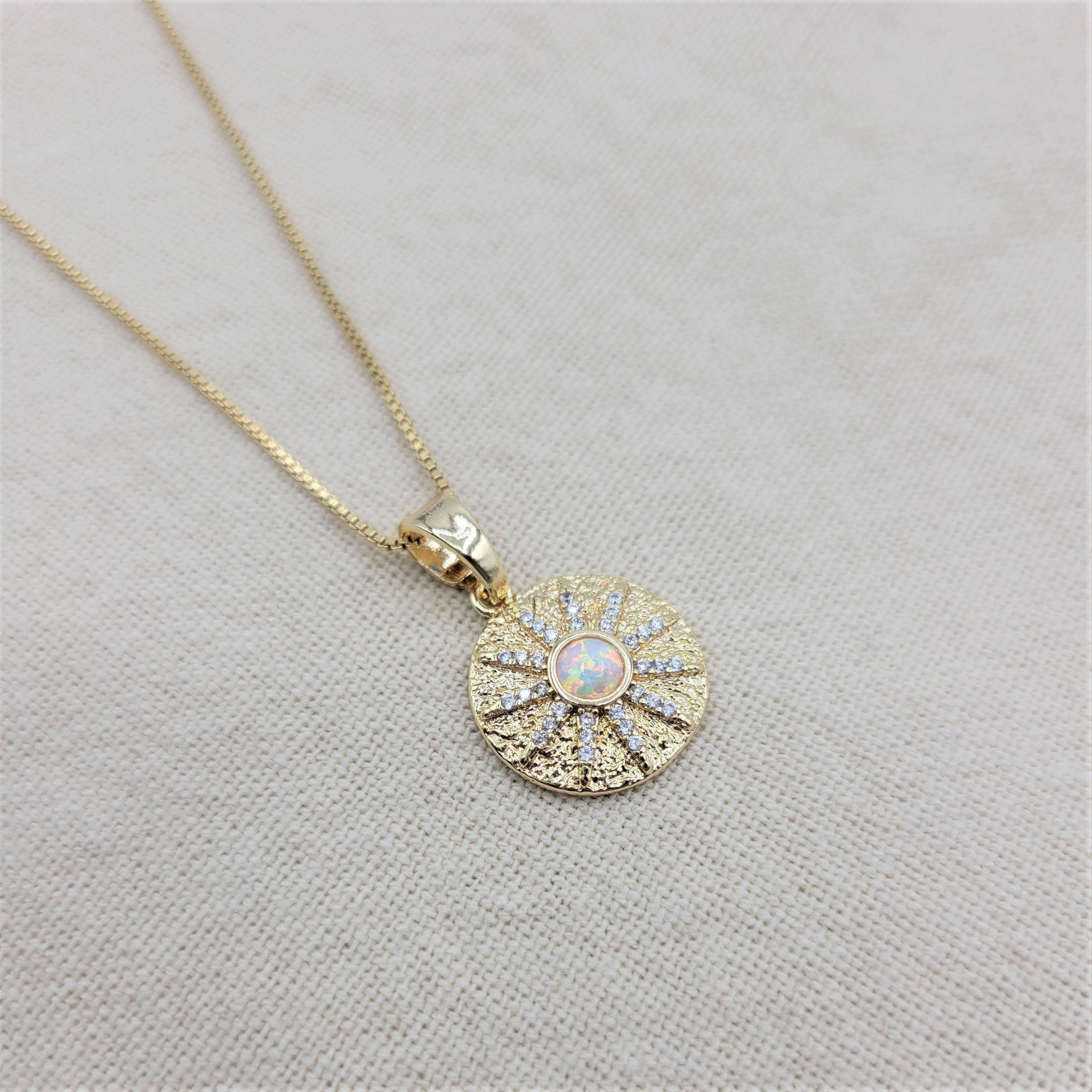 Eye catching opal sun necklace with micro pave zirconia detail. Dress it up or dress it down. Layer it or wear it solo. Crafted on sturdy non tarnish gold filled box chain.