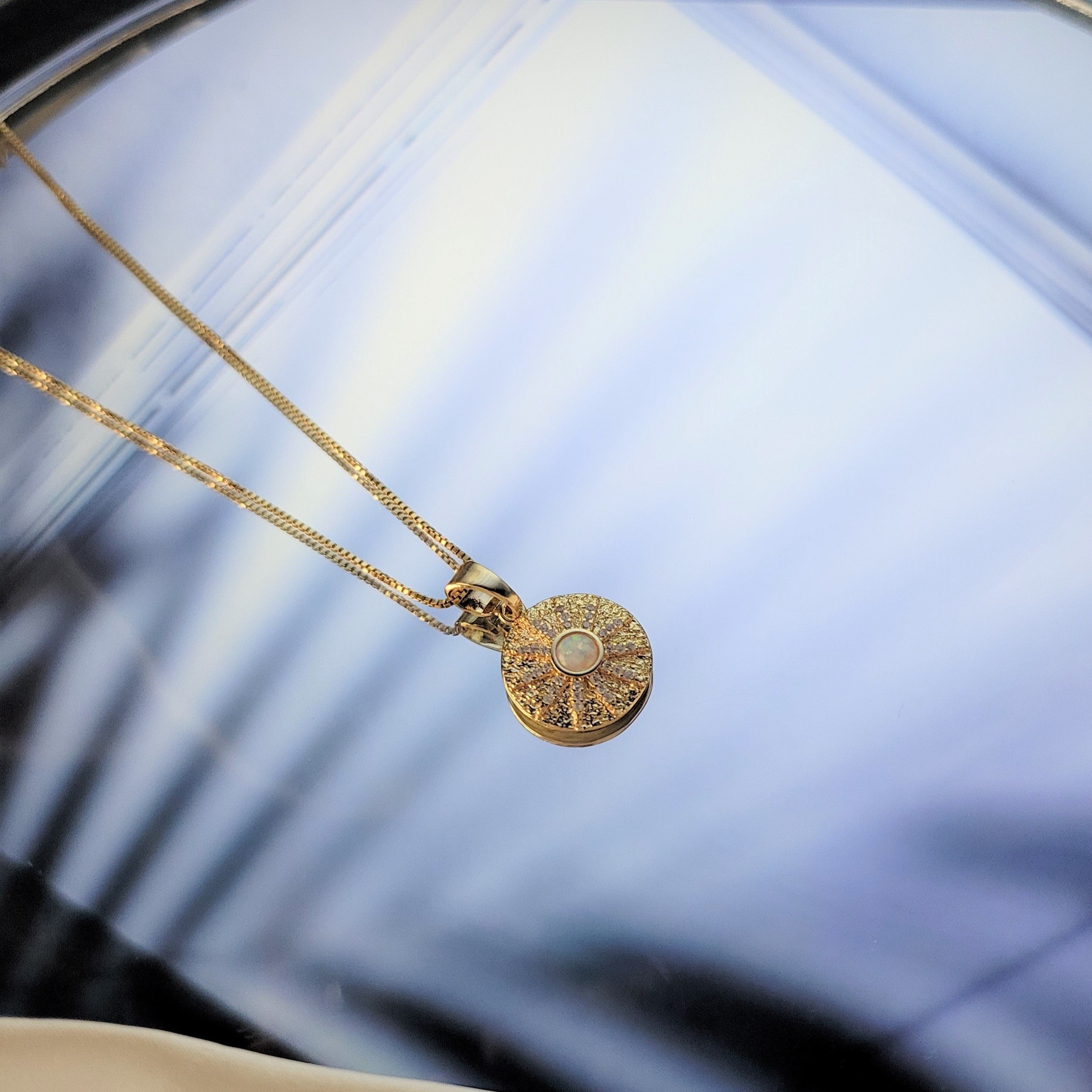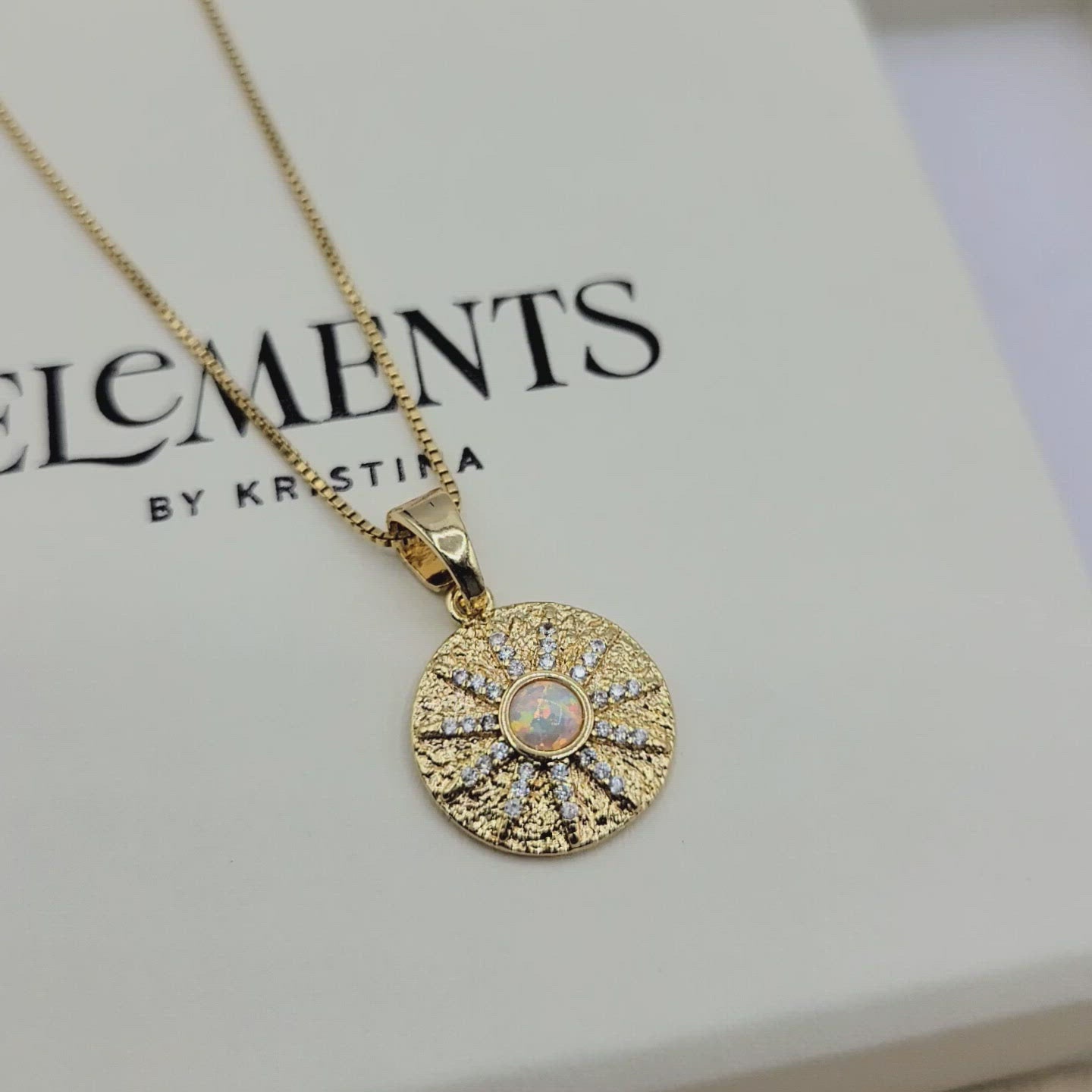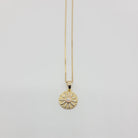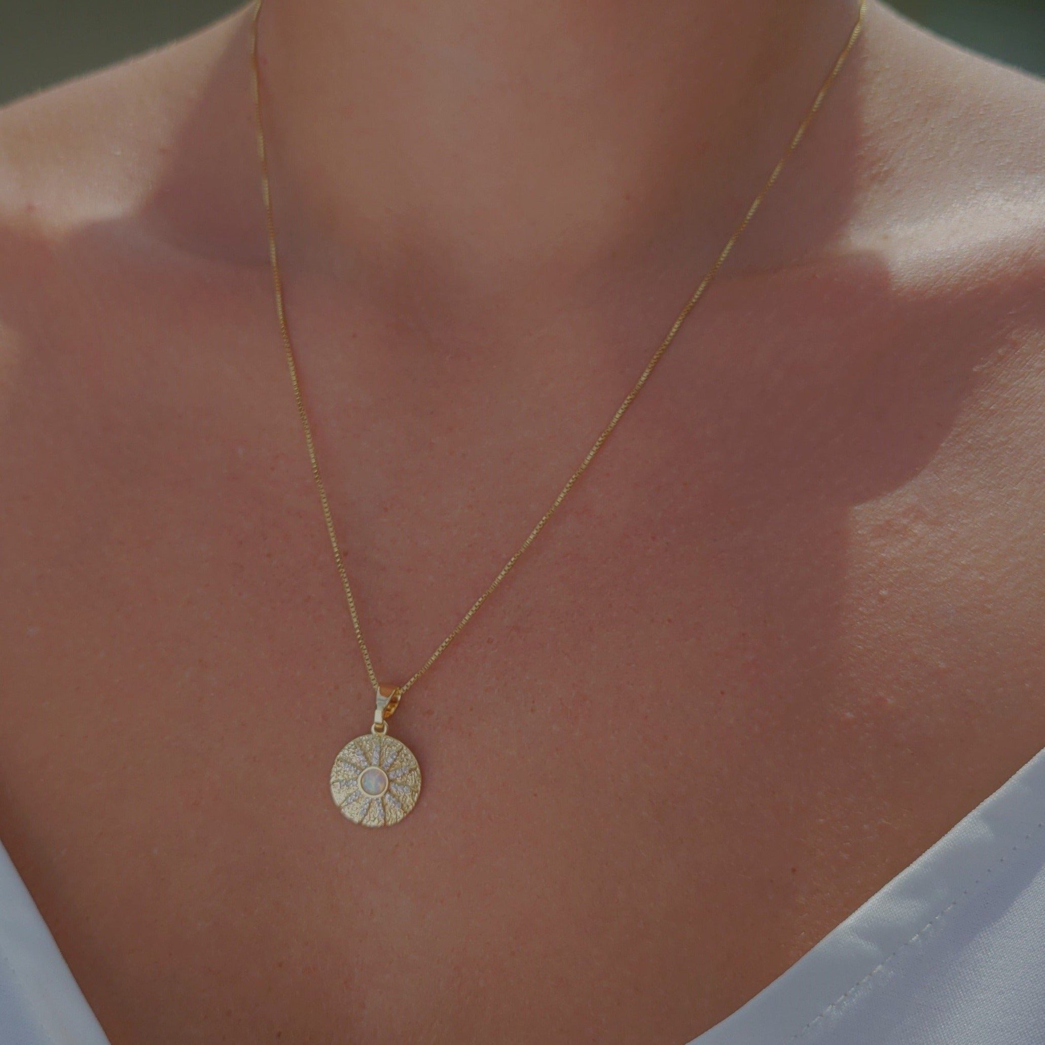Eye catching opal sun necklace with micro pave zirconia detail. Dress it up or dress it down. Layer it or wear it solo. Crafted on sturdy non tarnish gold filled box chain.