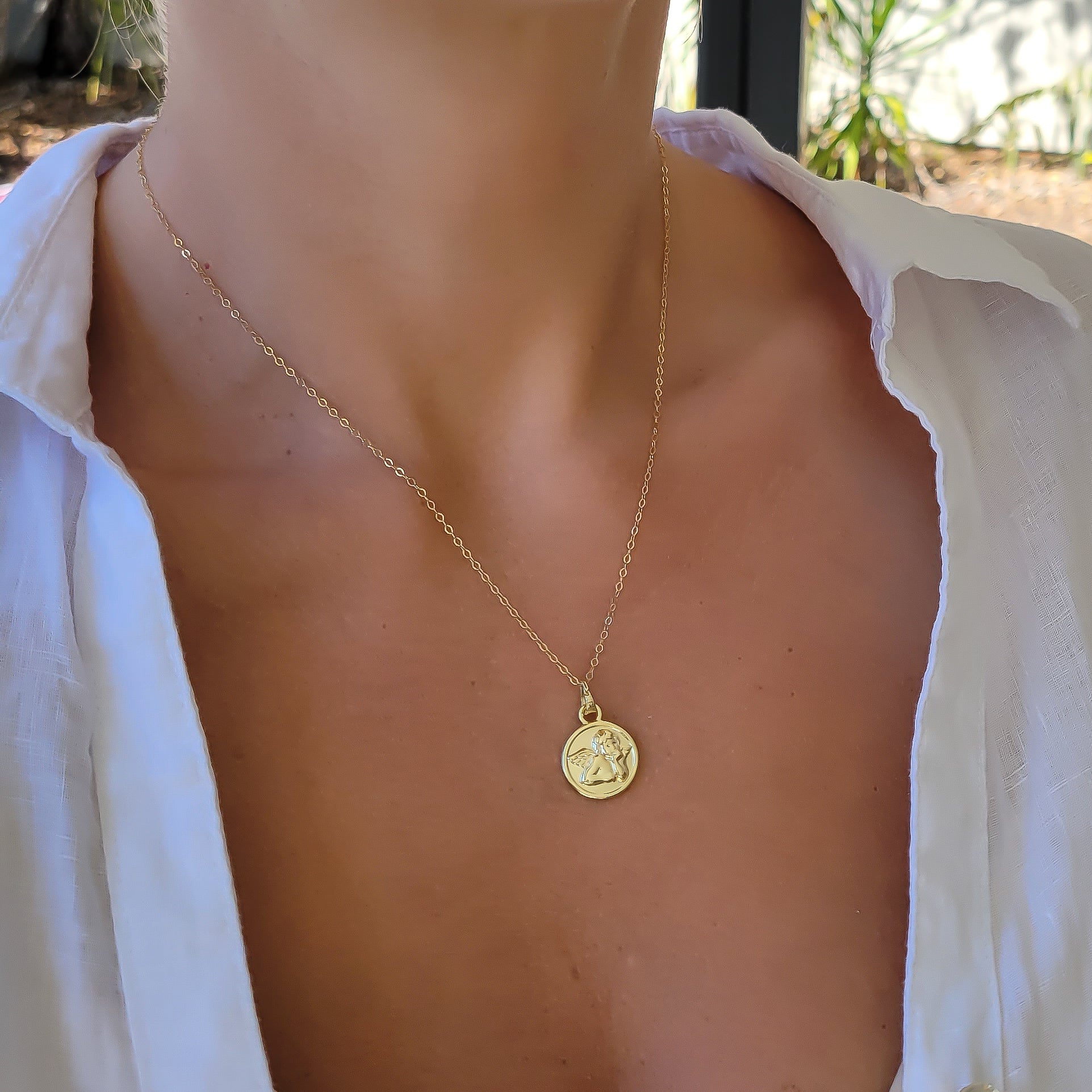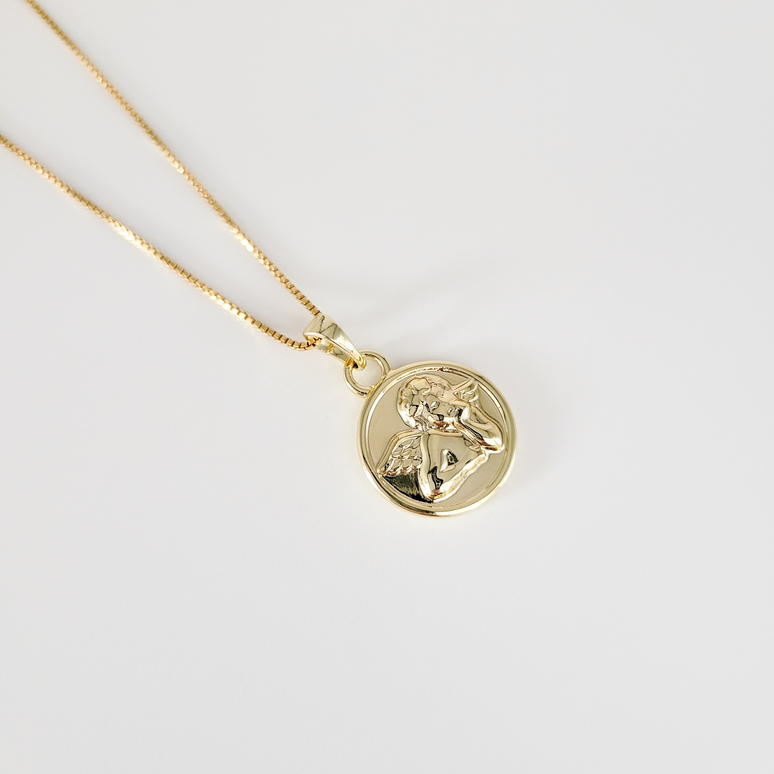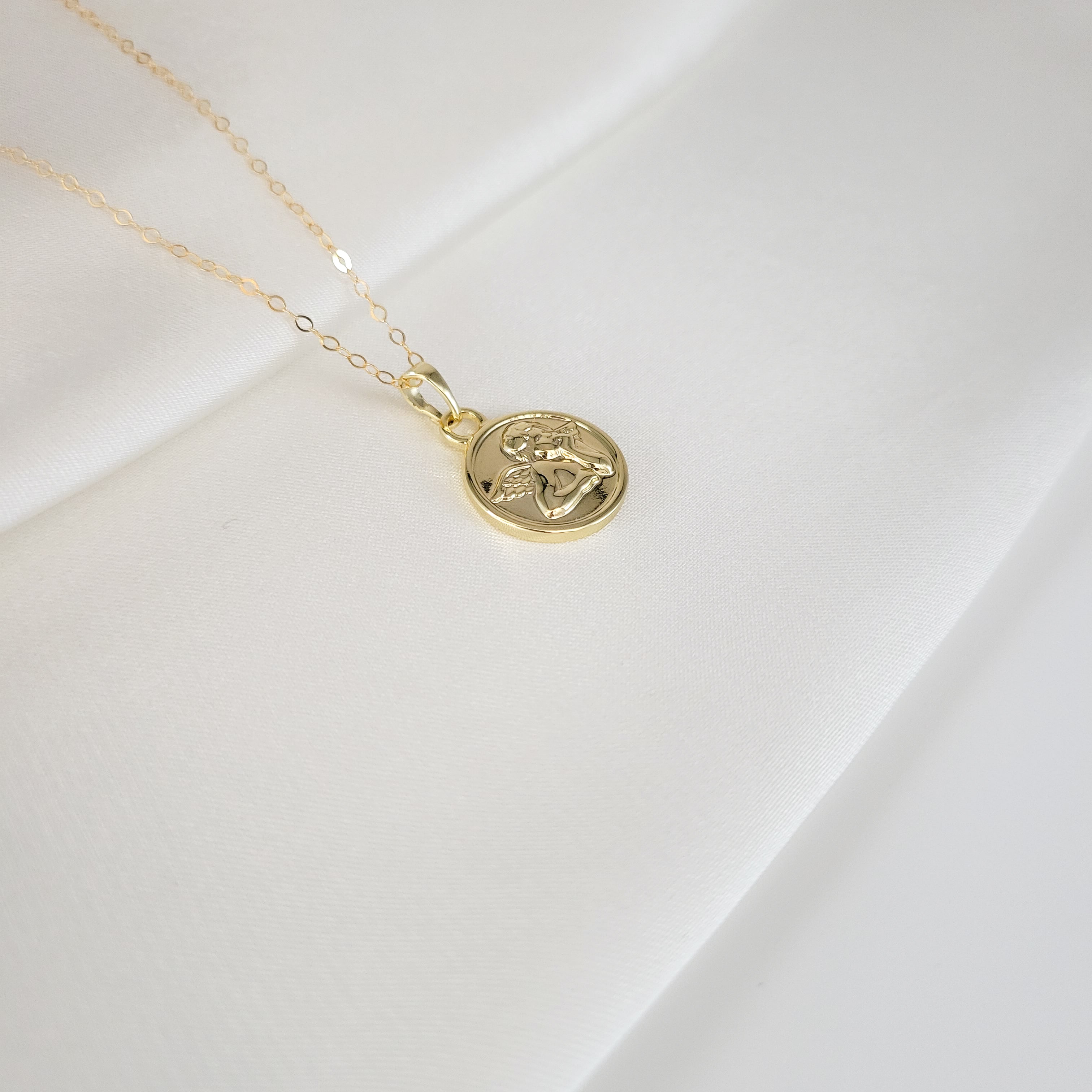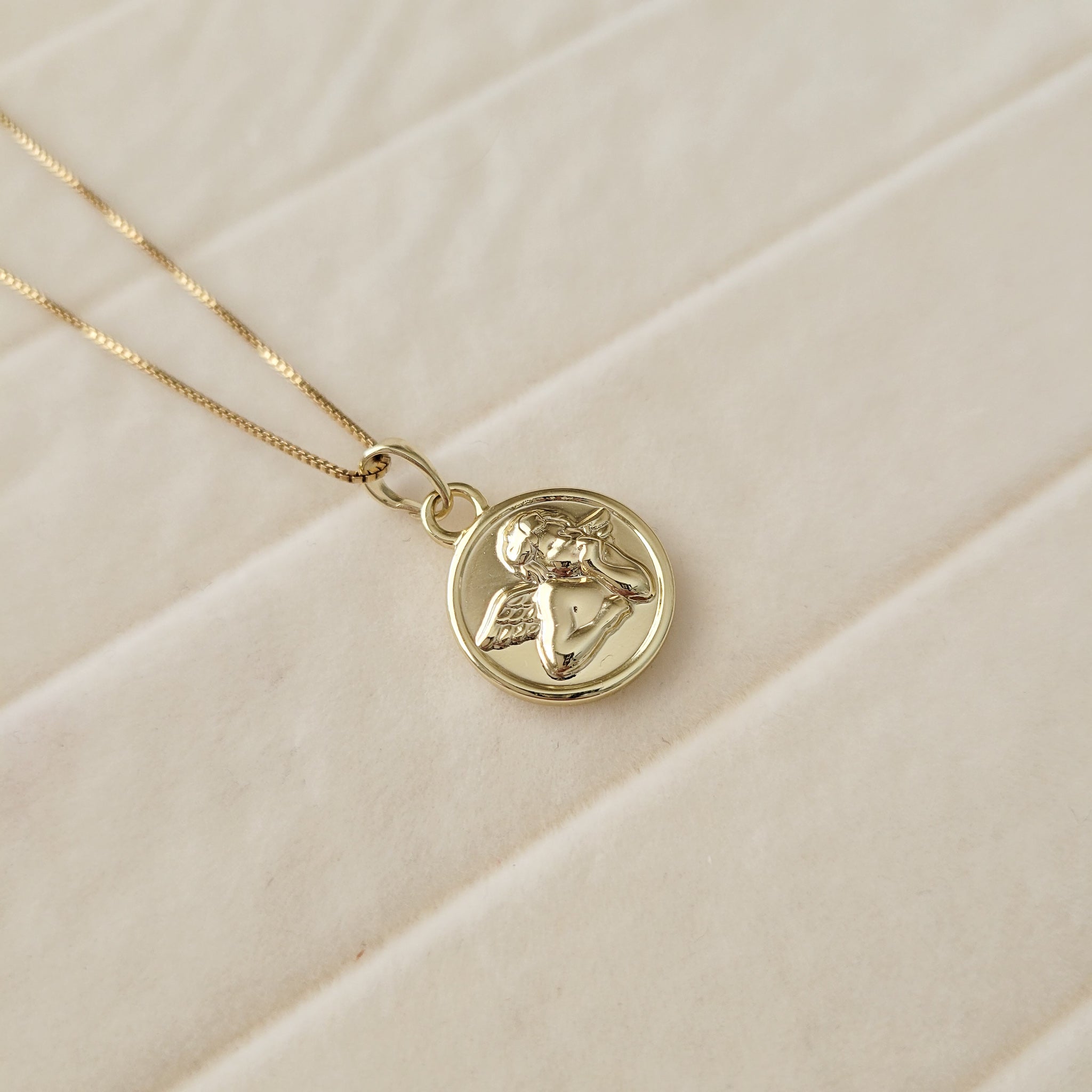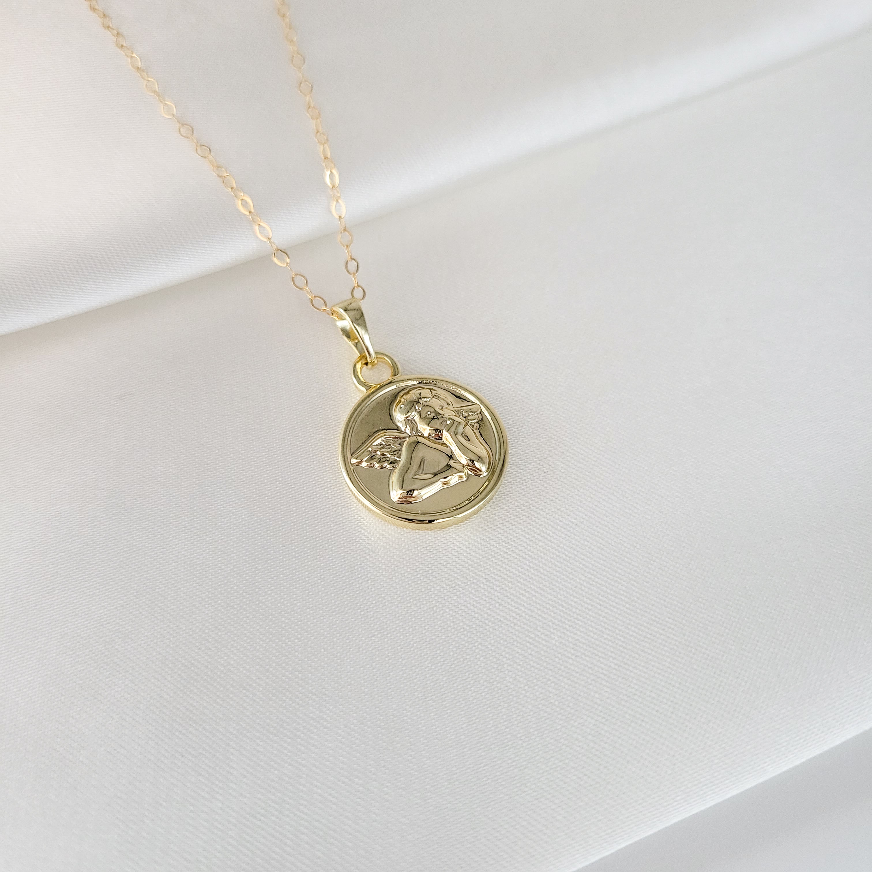 Gold Cherub guardian angel round gold coin pendant necklace. Wear it close to your heart on it own or layer it. Choose between dainty non tarnish gold filled chain (16' + 2' extension) or sturdy gold filled box chain.