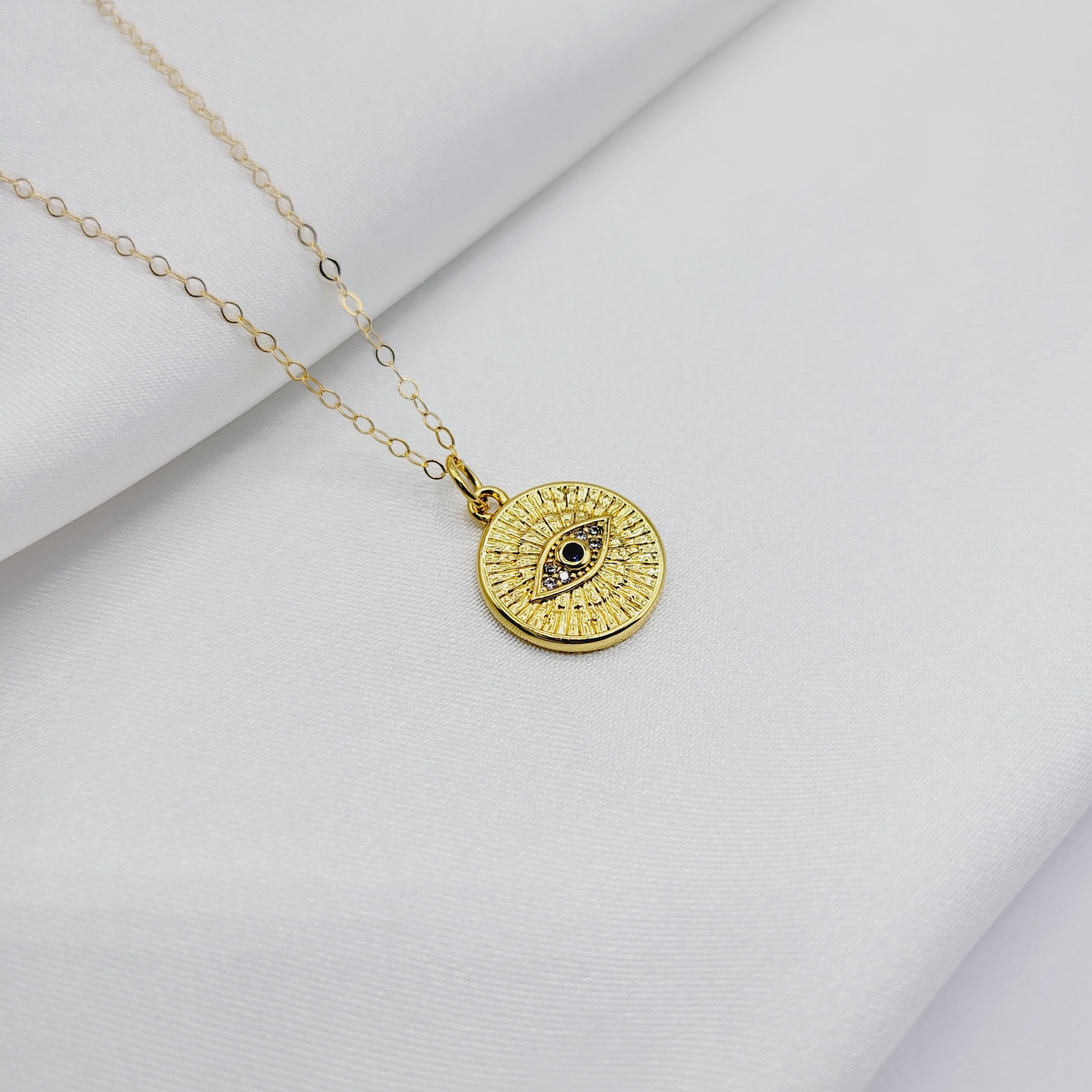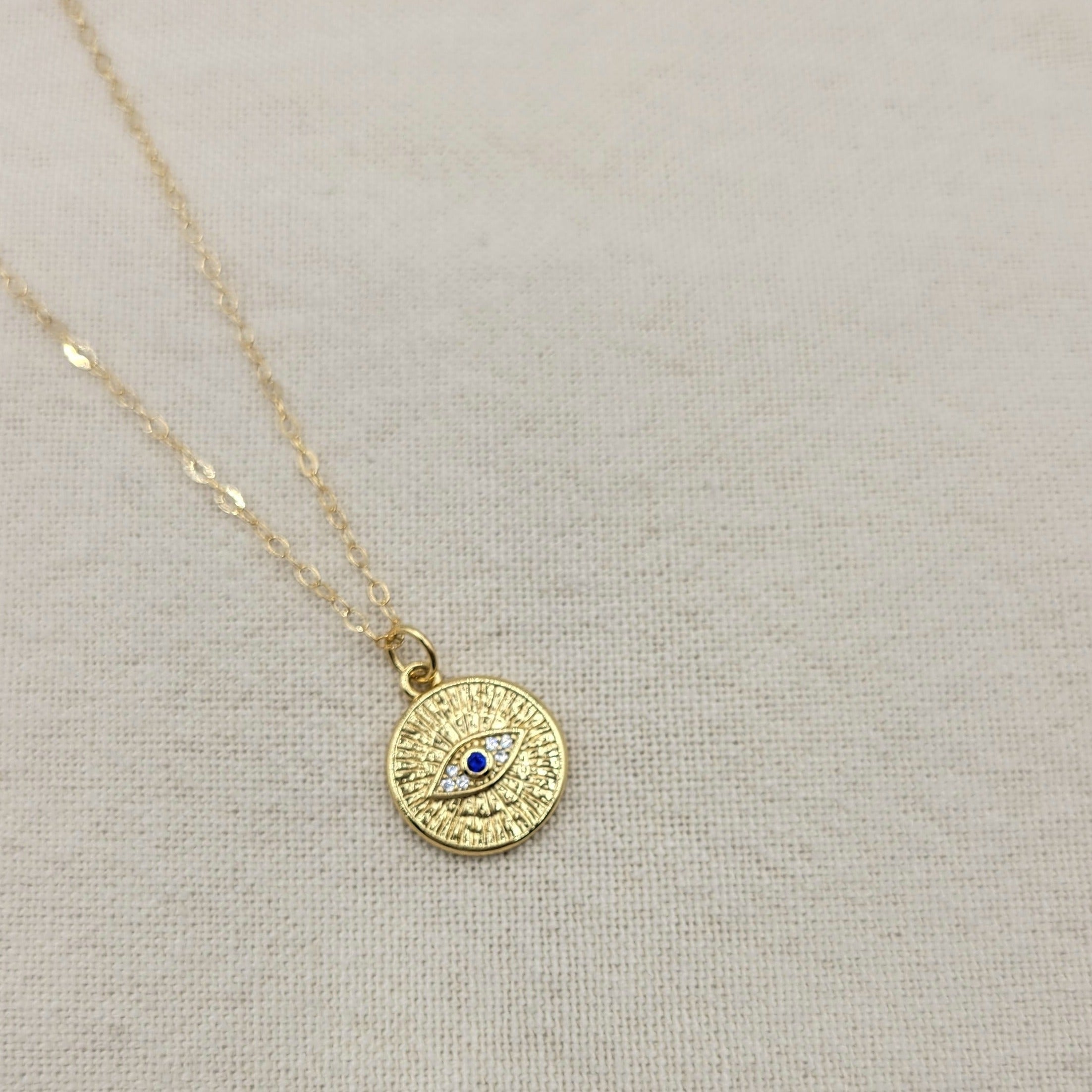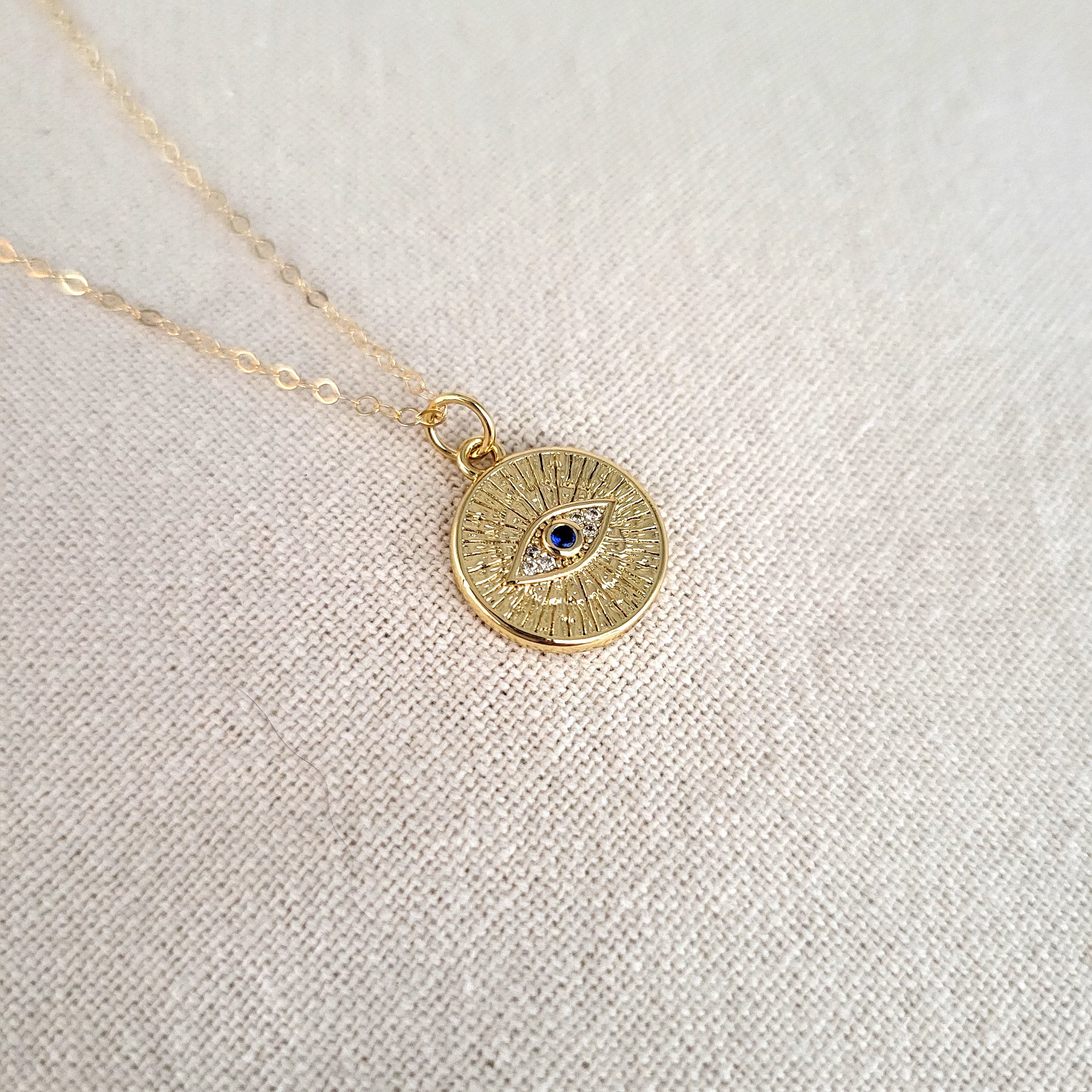 Gold filled crystal evil eye charm necklace. Wear it on its own or layer it. Strung on sturdy non tarnish gold filled very dainty cable chain.