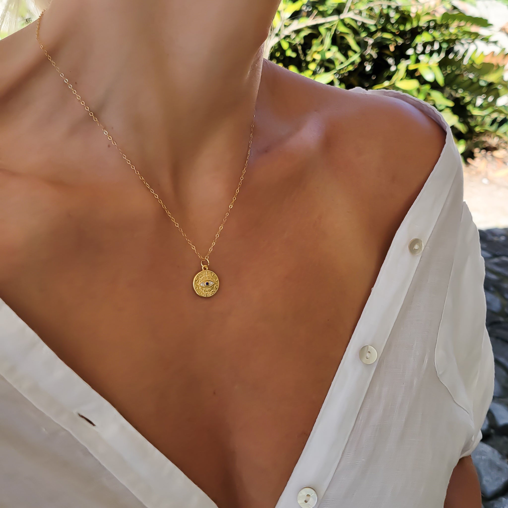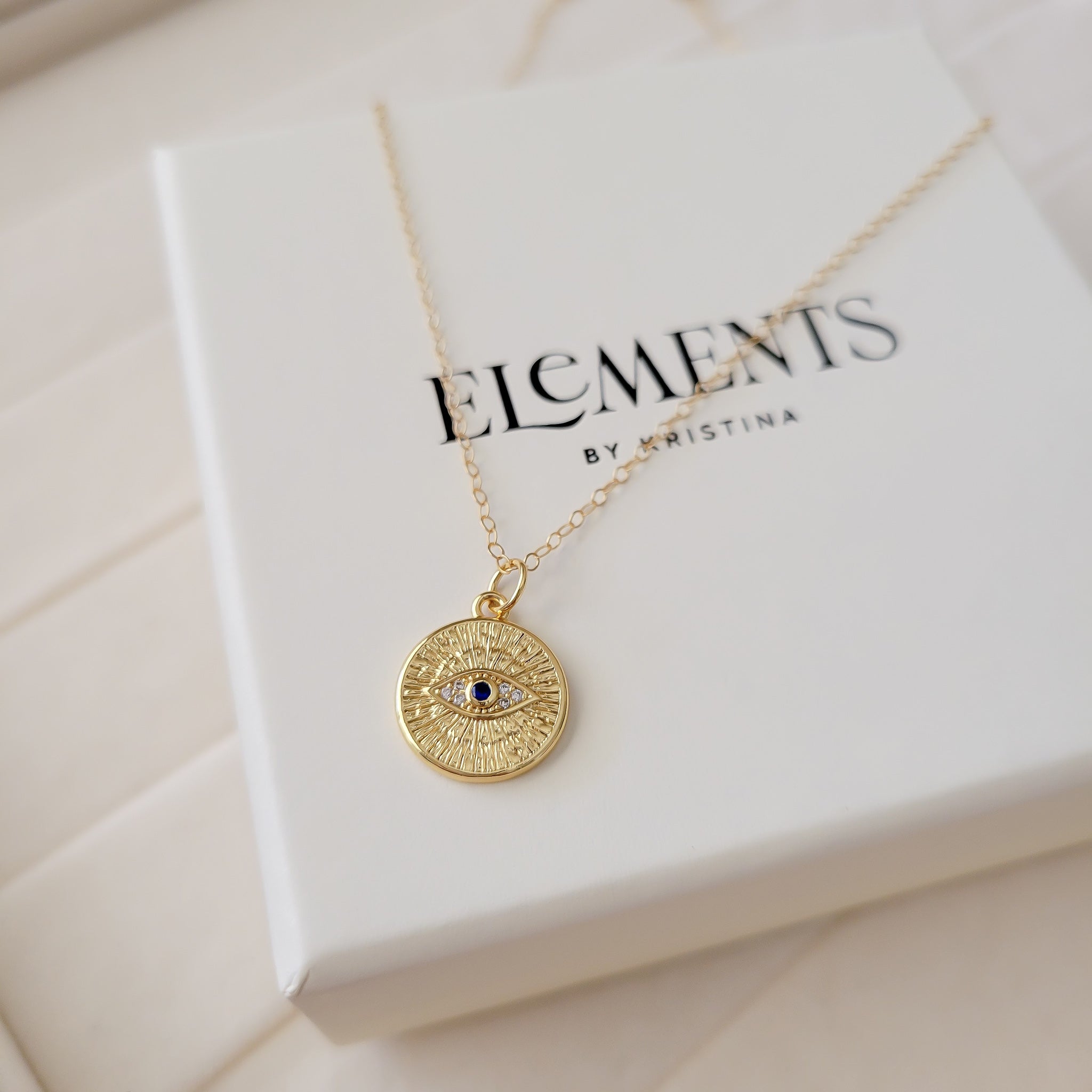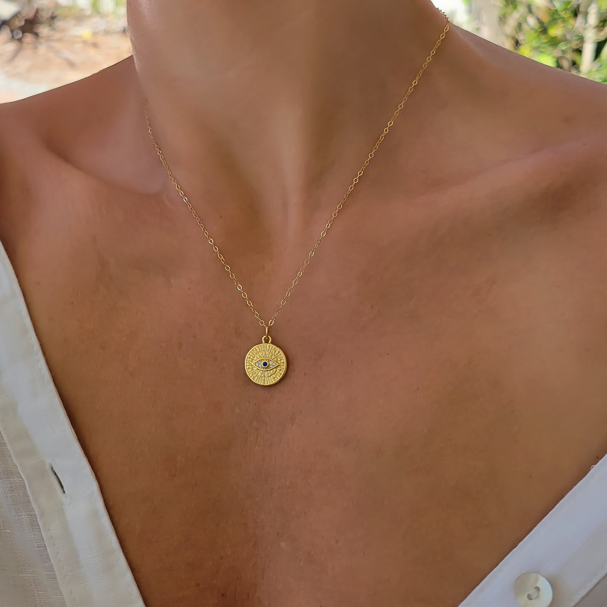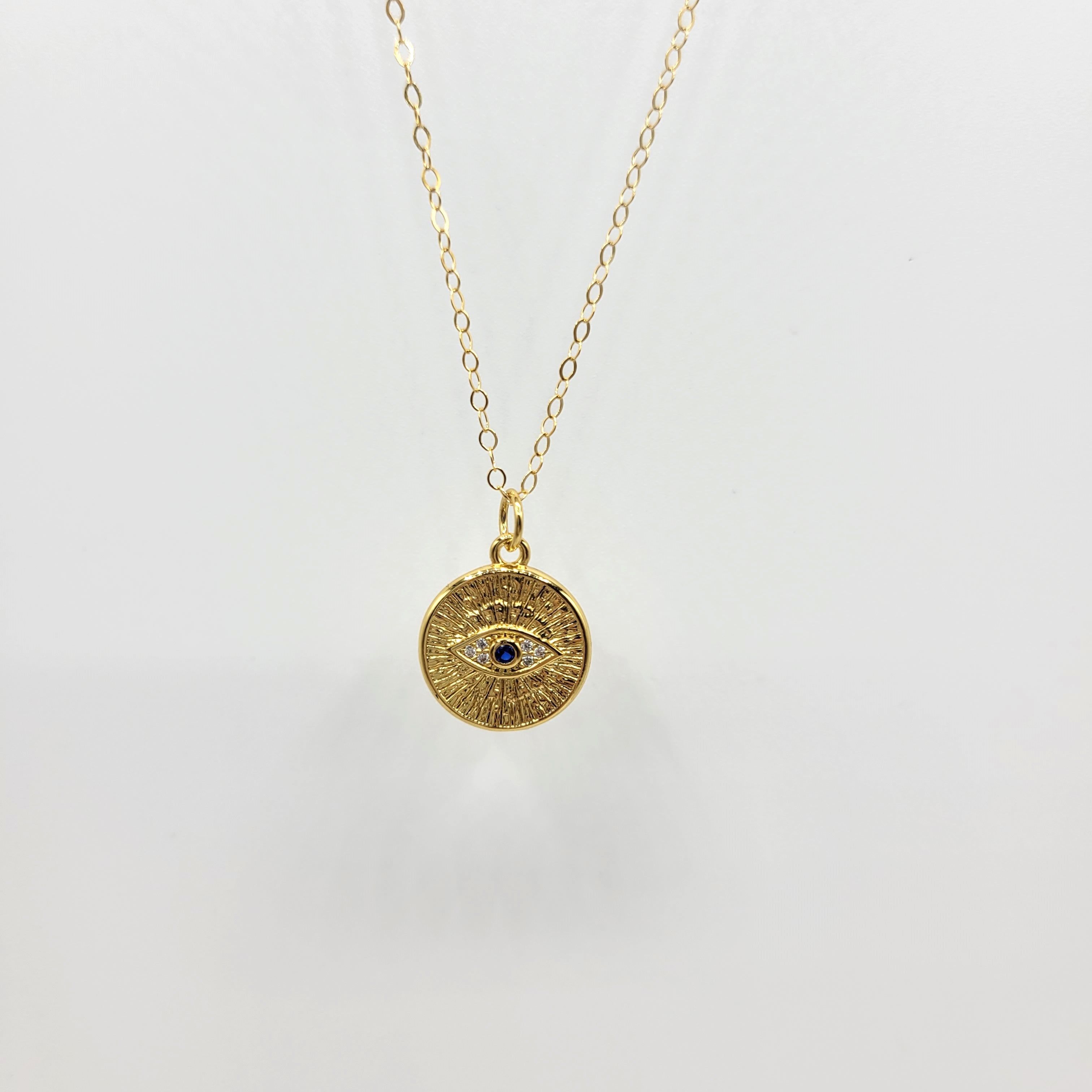 Gold filled crystal evil eye charm necklace. Wear it on its own or layer it. Strung on sturdy non tarnish gold filled very dainty cable chain.