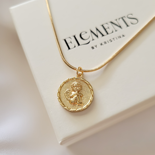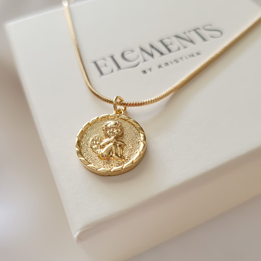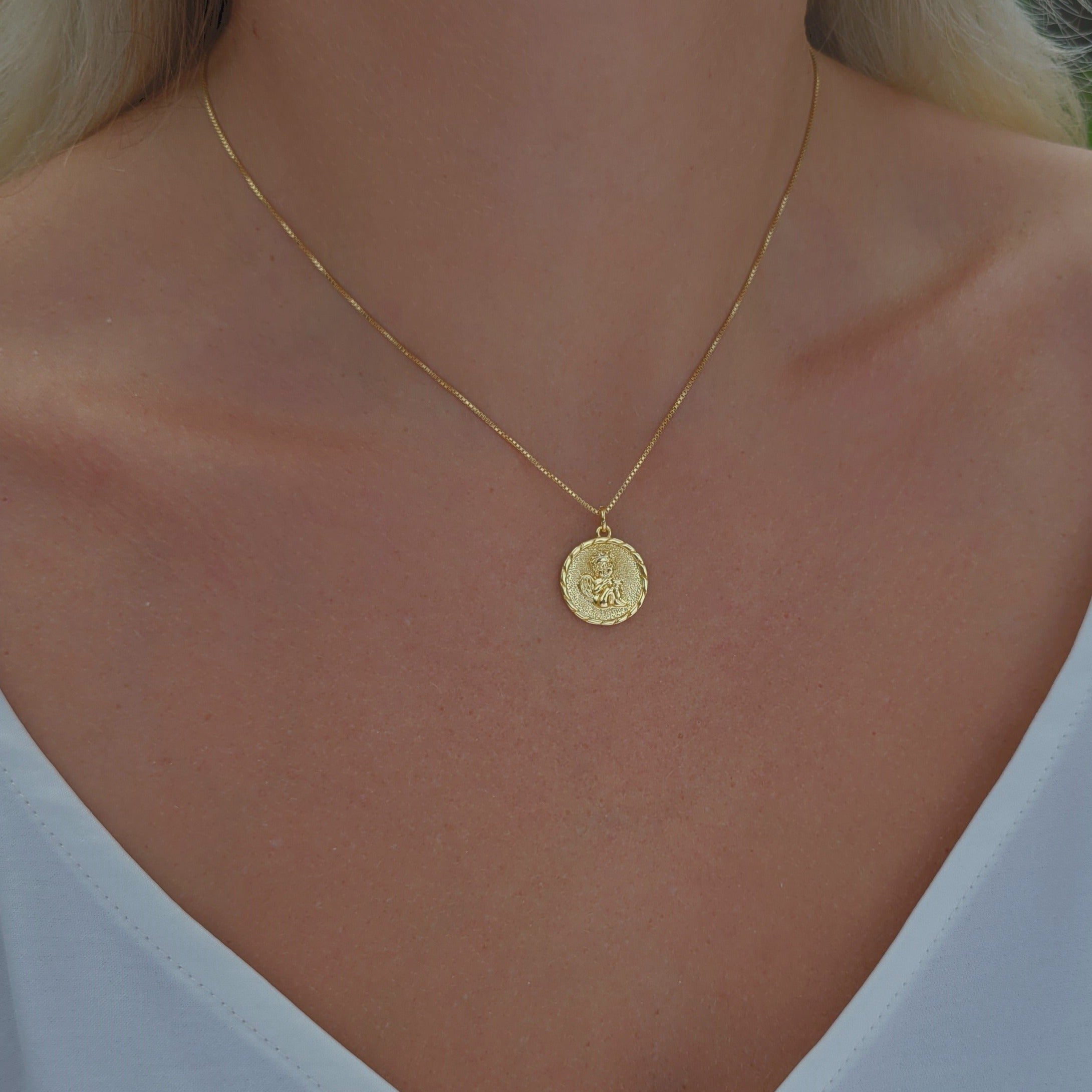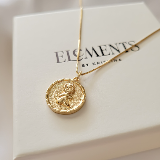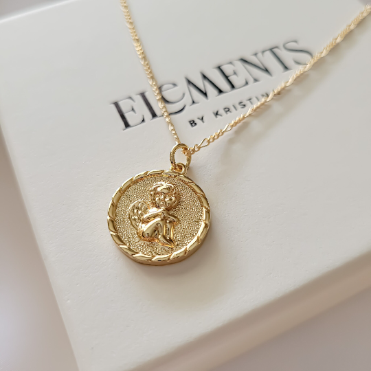 Helen guardian angel round gold coin pendant necklace. Wear it close to your heart on it own or layer it. Crafted on sturdy non tarnish gold filled box chain.