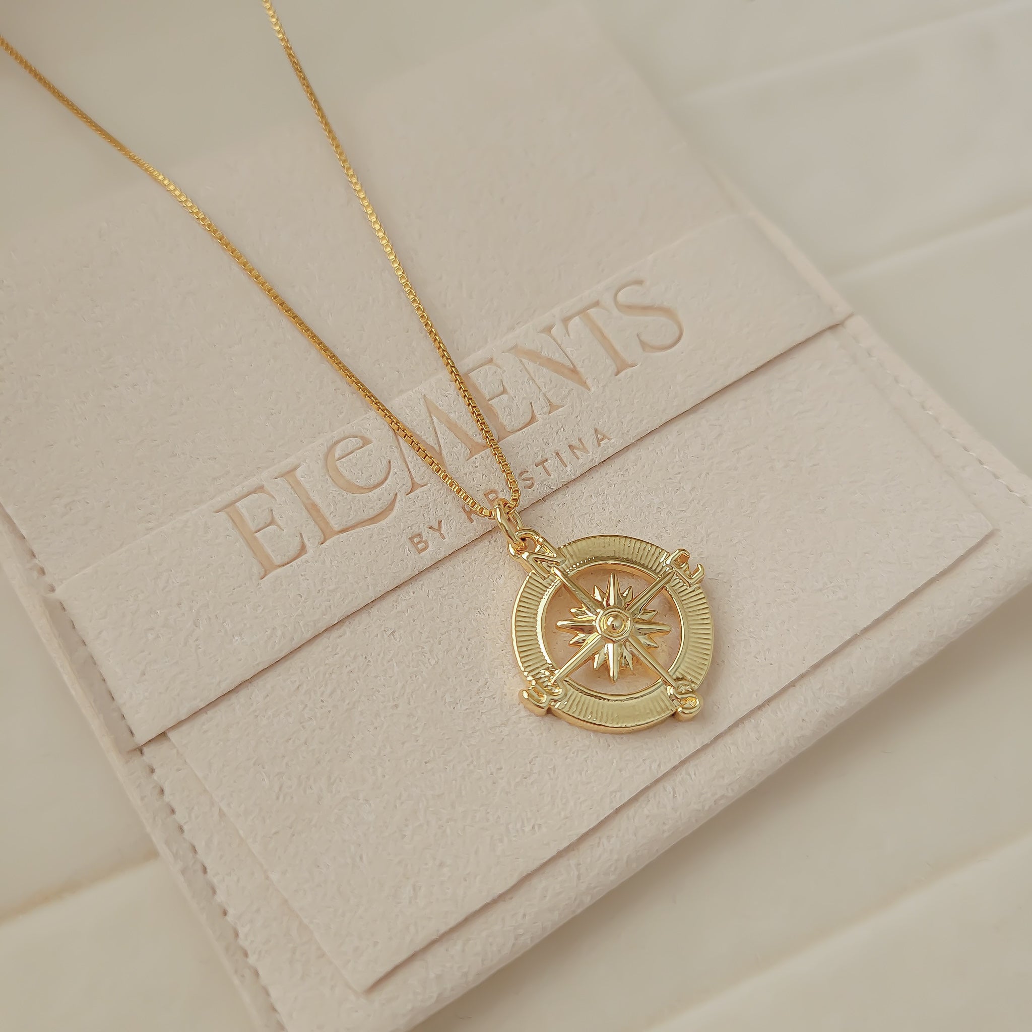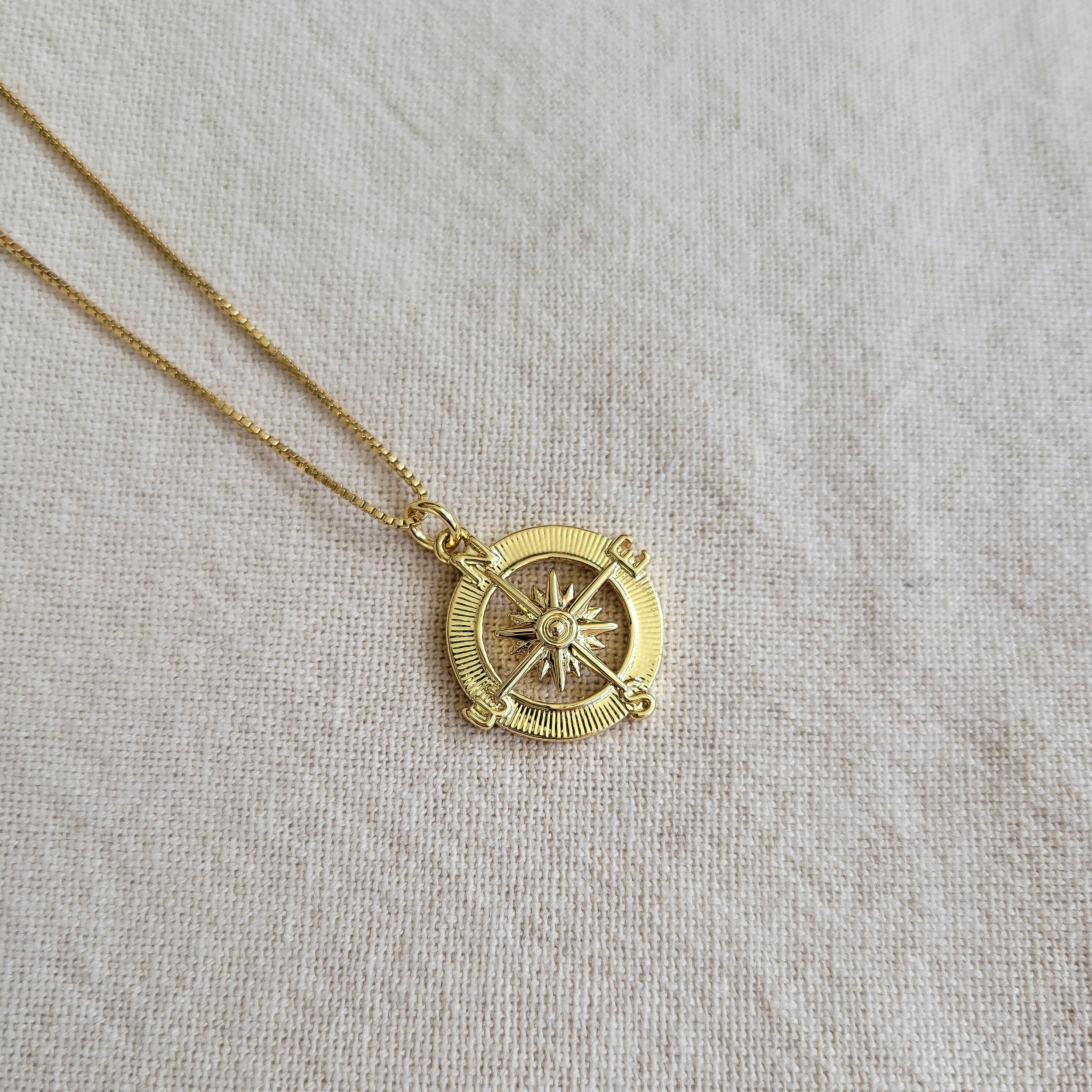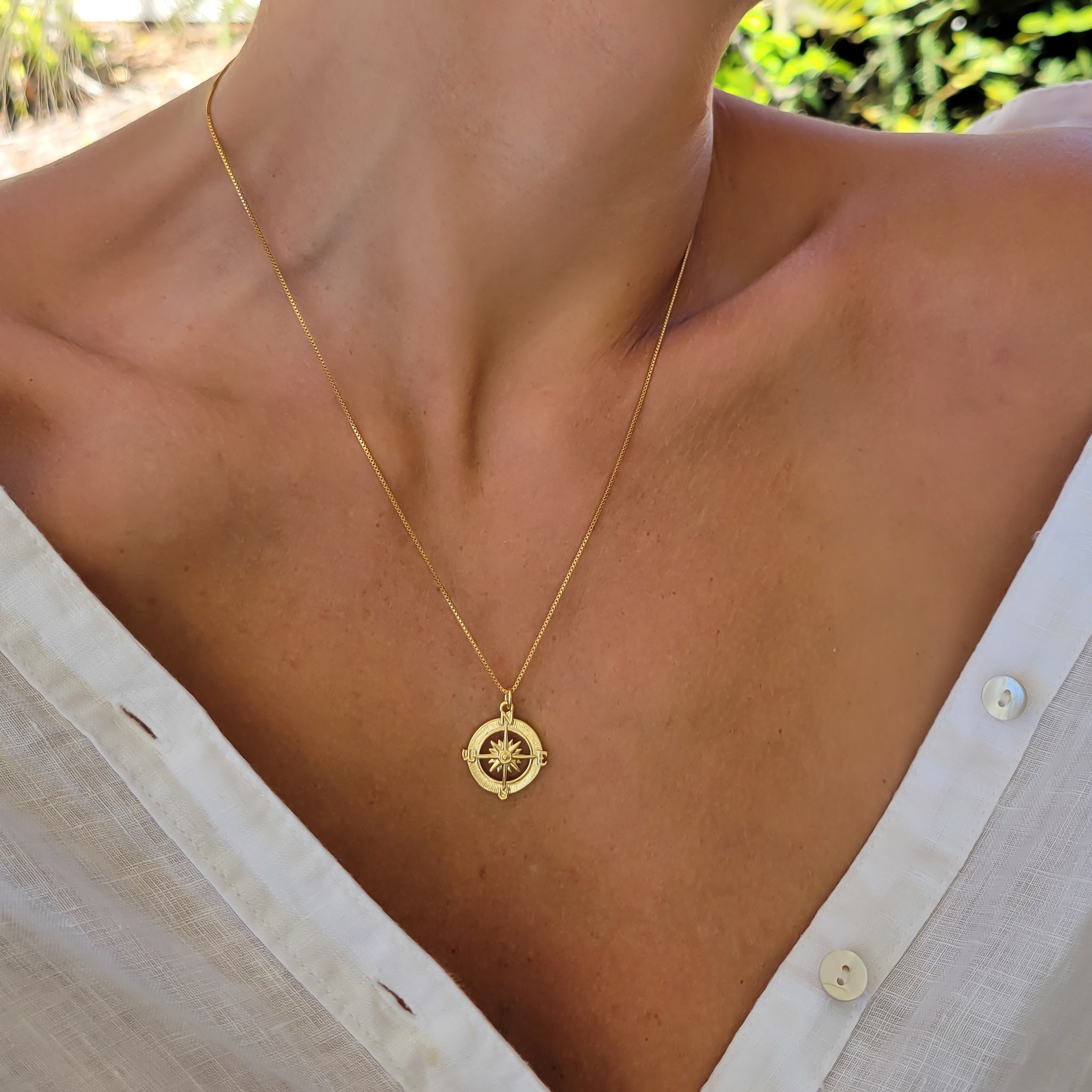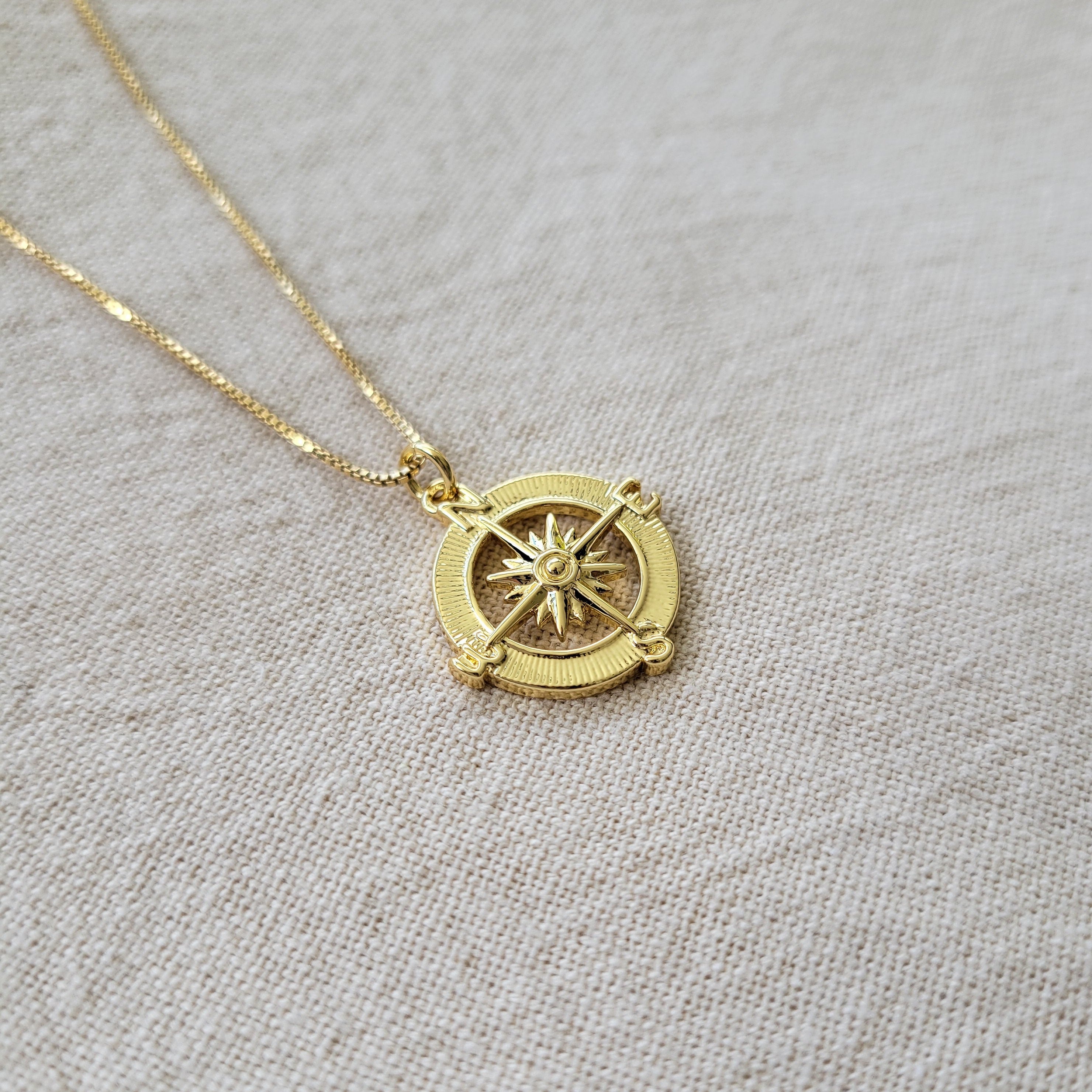 Round gold compass pendant necklace. Wear it on it's own or layer it. Crafted on sturdy non tarnish gold filled box chain.