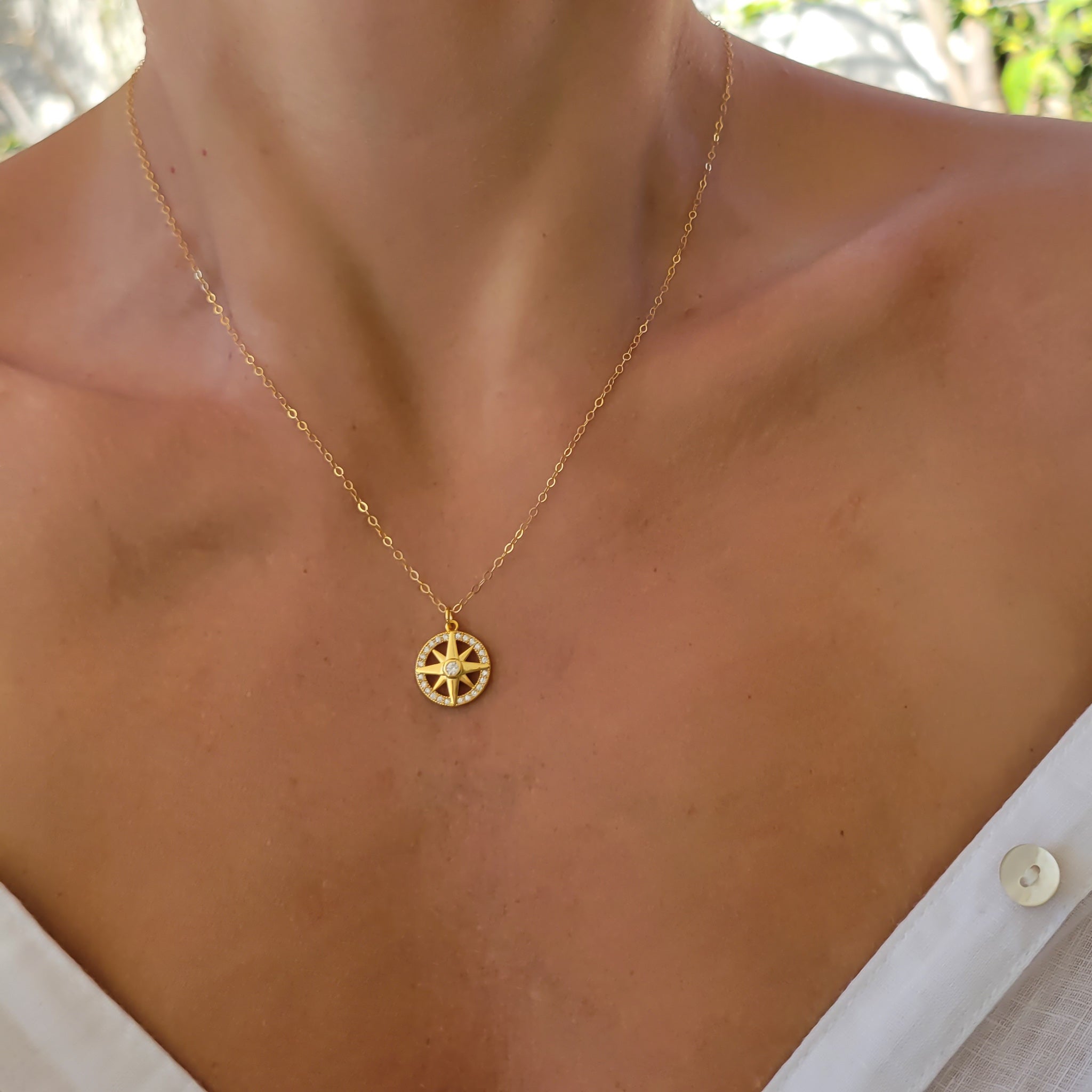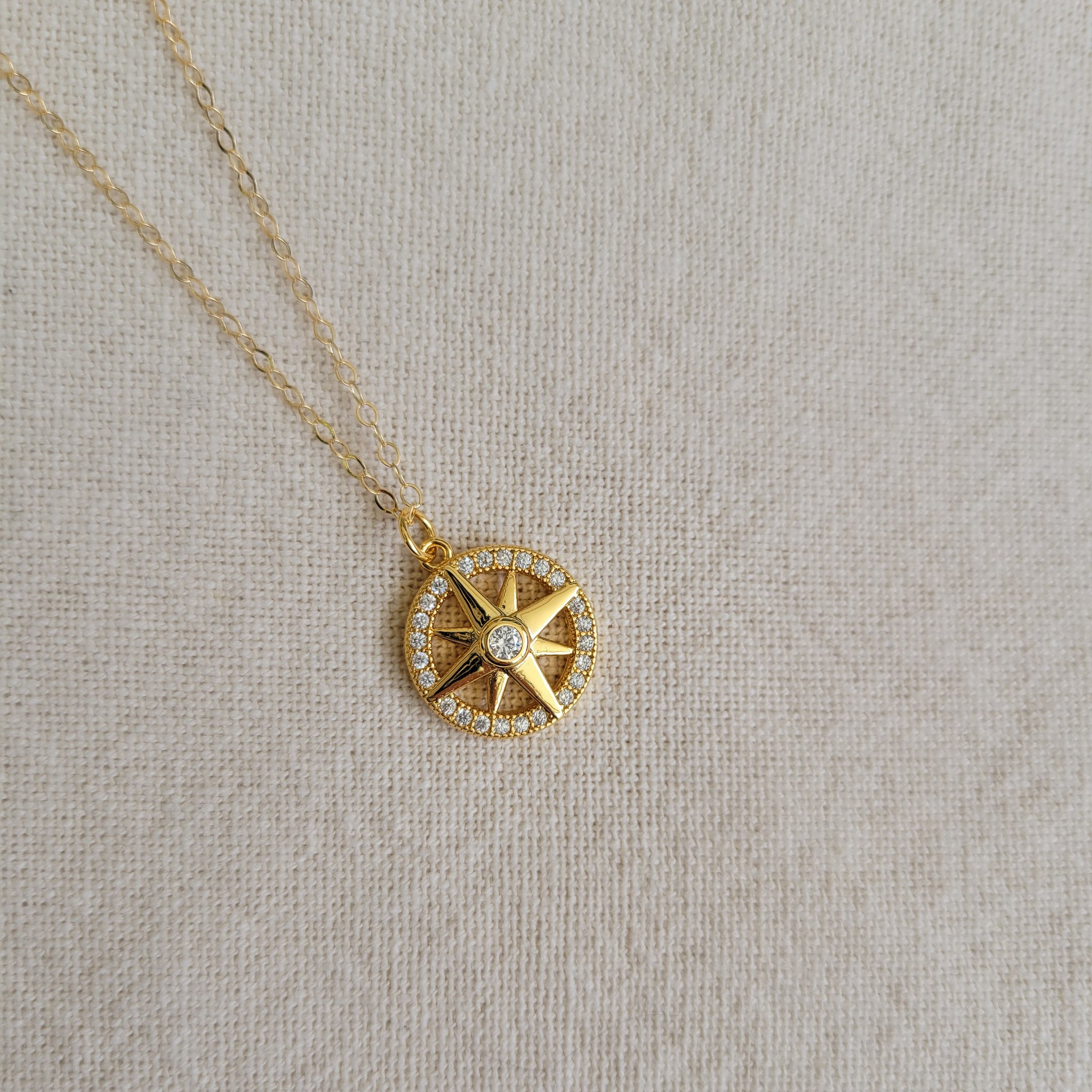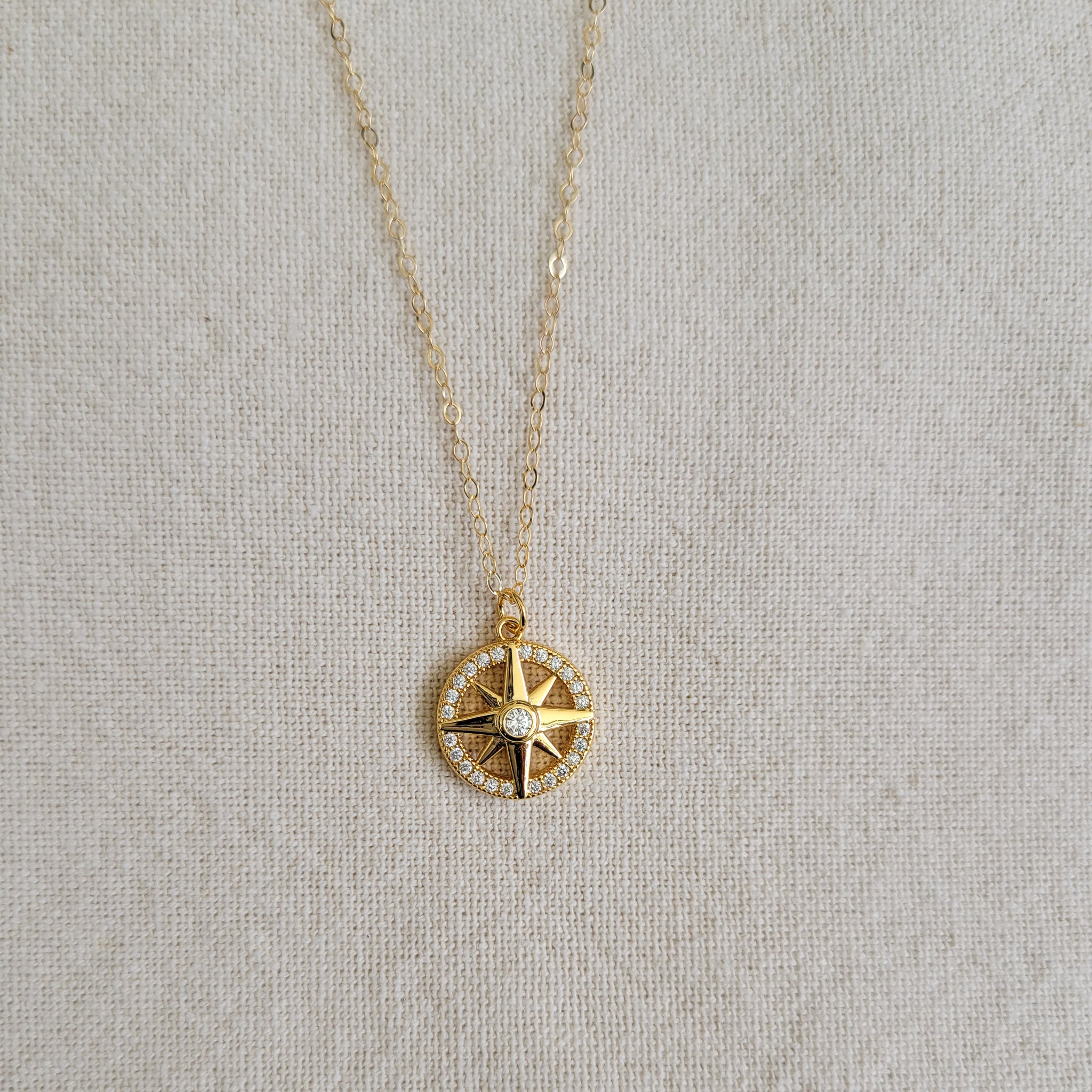 Round gold compass pendant necklace. Wear it on it's own or layer it. Strung on sturdy non tarnish gold filled very dainty cable chain.