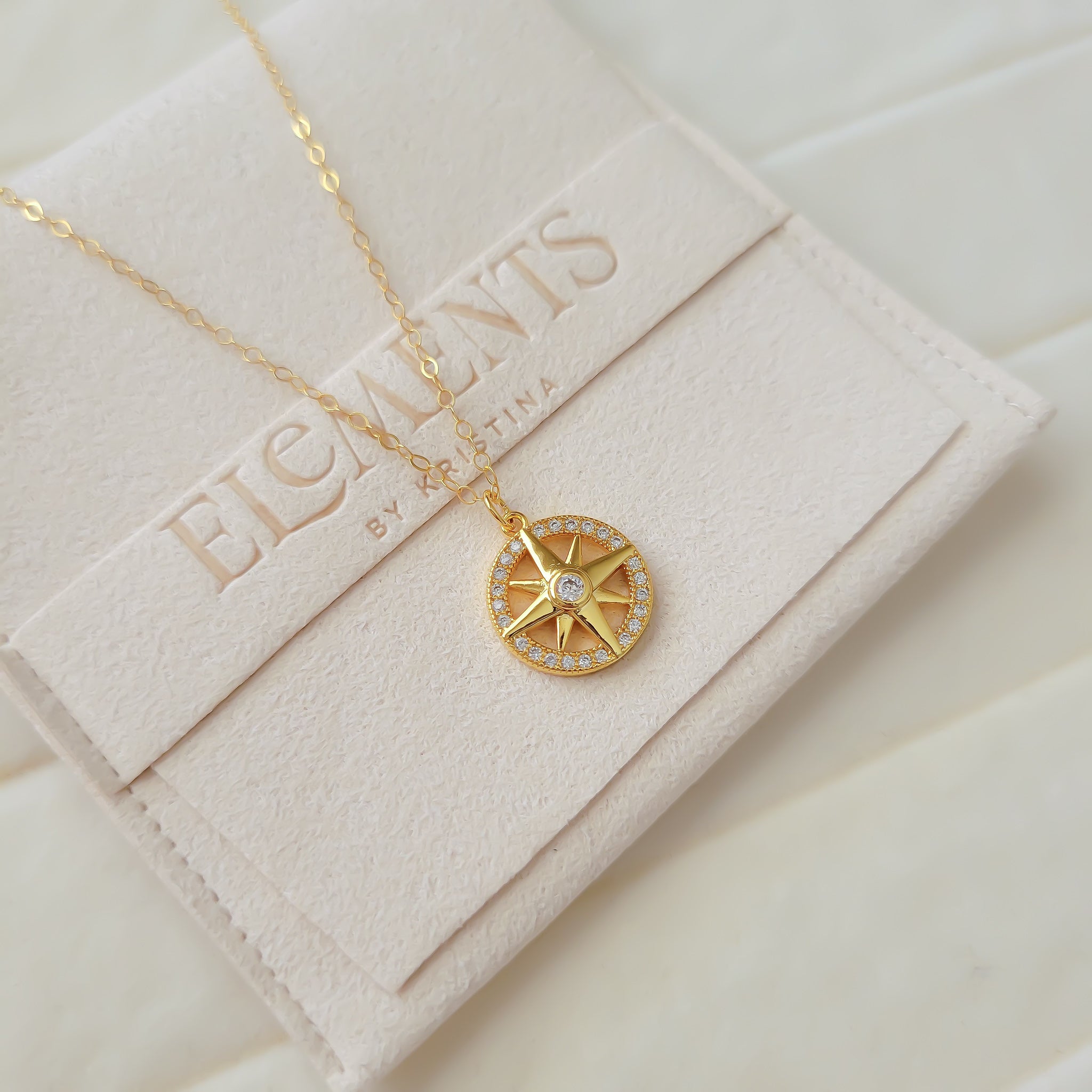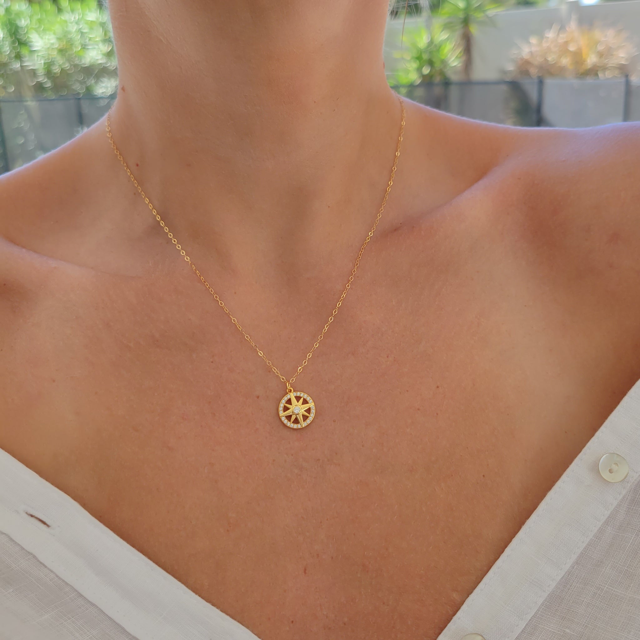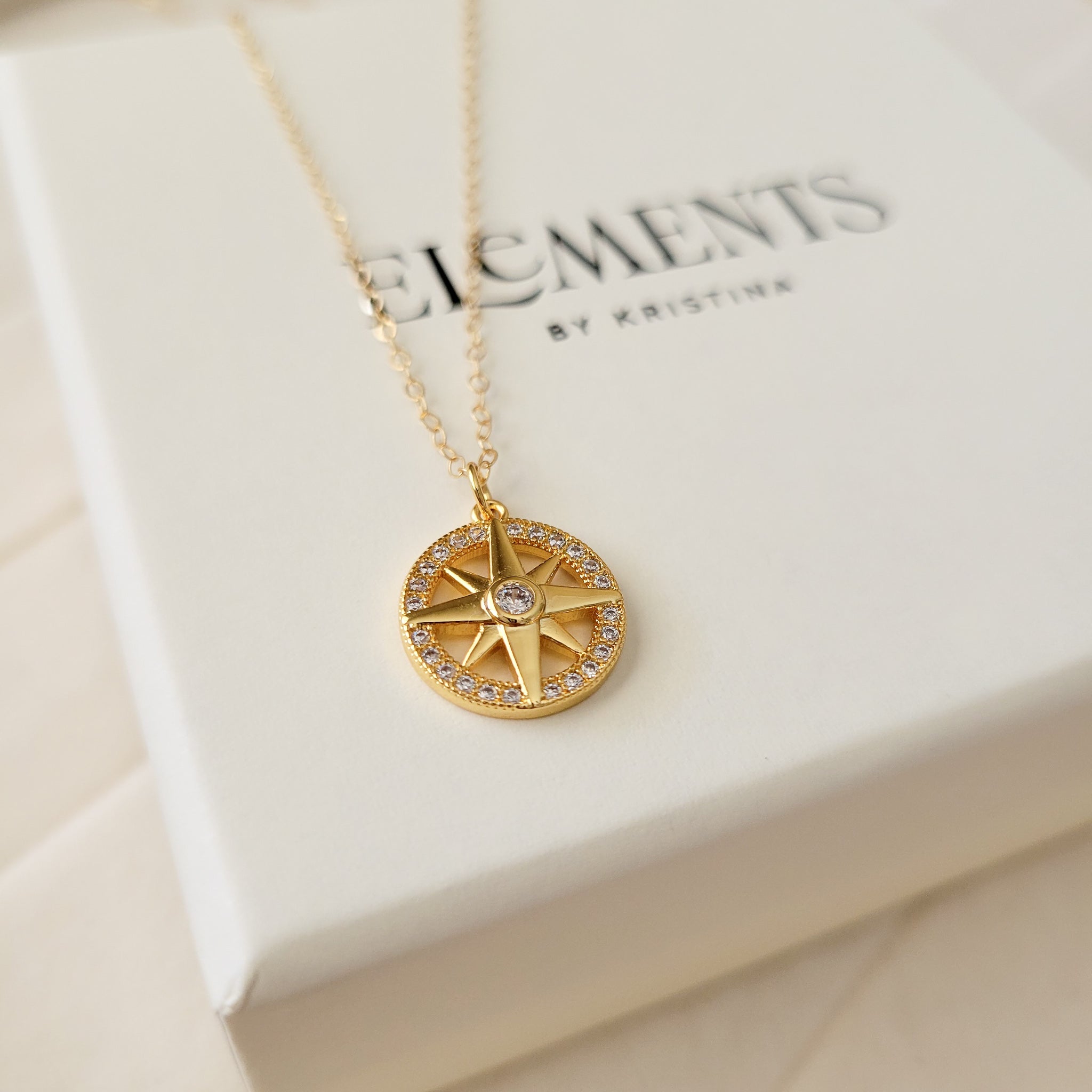 Round gold compass pendant necklace. Wear it on it's own or layer it. Strung on sturdy non tarnish gold filled very dainty cable chain.